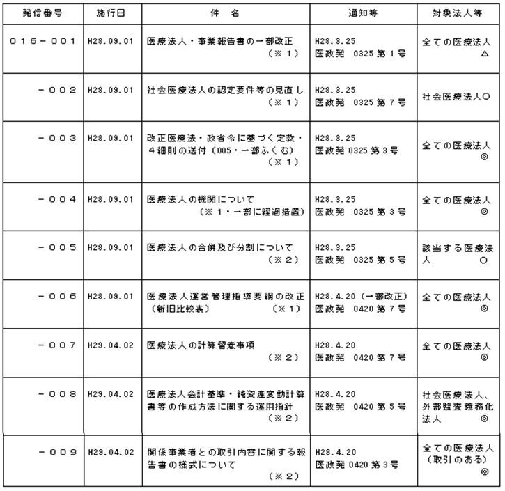 すべての通知に私見に基づくポイントを示しています。この一覧表の対象法人等に付した◎、○、△印は、医療法人にとっての重要度を示しています。(平成28年7月27日現在)
